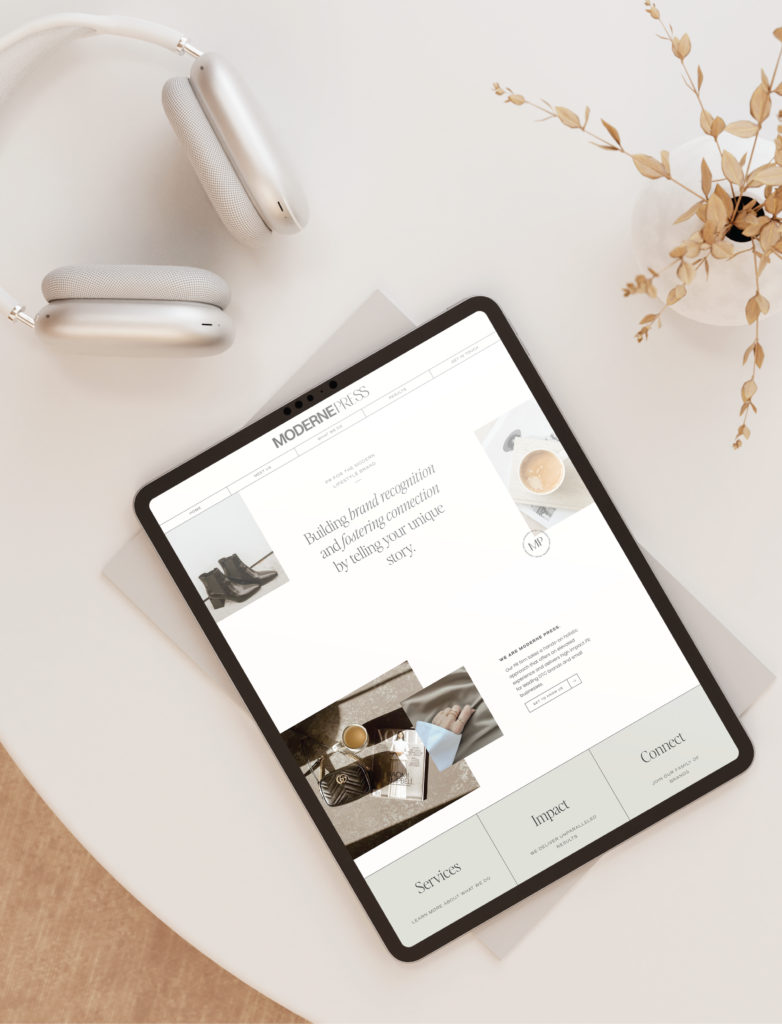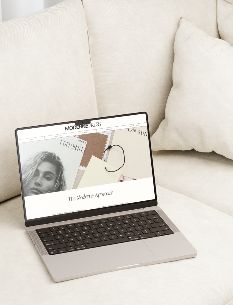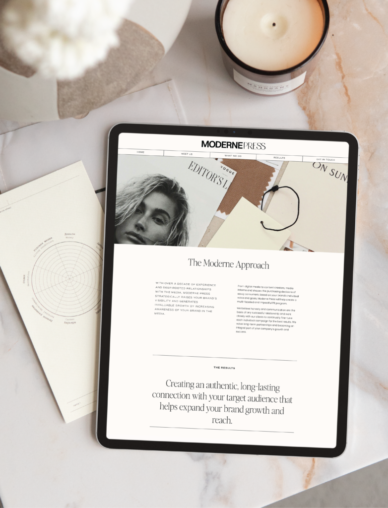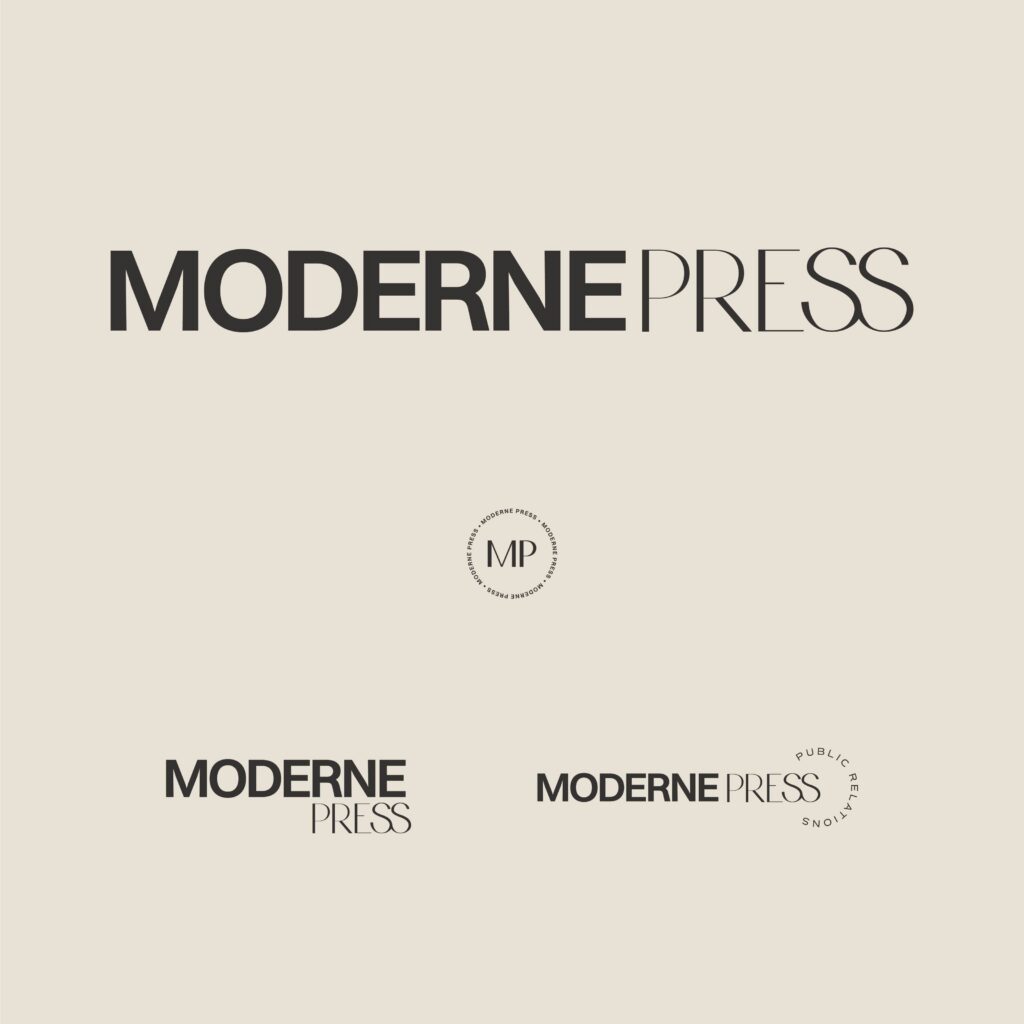 The vision for Moderne Press is to employ a primarily female team who are passionate about business and community building that can work one-on-one building relationships and platforms for businesses with a strong mission. We wanted this next chapter of Moderne Press to be a time when they can rise to the top and become a trend-setting, progressive PR agency that consistently works with mid to high-level brands who are looking to disrupt their industries and create strong relationships with the public. With innovative ideas and a creative mindset, Moderne Press is media-focused, elevated, editorial, and energetic. We deployed these objectives through 3 key visual themes: editorial chic, modern business, and urban cool. We decided to lean hard into the shared love of fashion that both New York and California adopt so effortlessly. We can either downplay the style for relatability or elevate for professionalism, giving the brand more flexibility and adaptability based on market trends. We wanted to create a brand that felt modern and professional but also stylish and aspirational. It’s a mix of trend-worthy visuals with strong, timeless design that makes the agency feel strong while giving each agent a progressive, relatable aura.