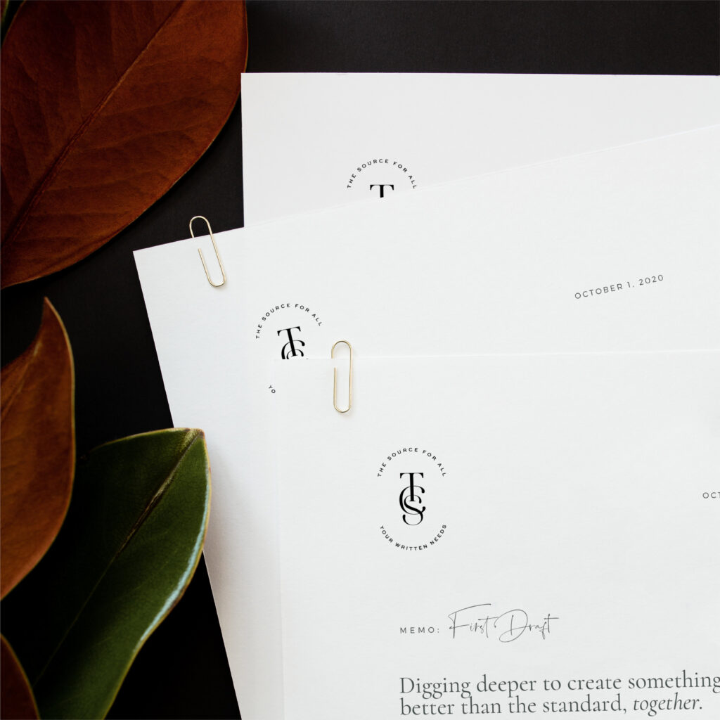 Katie felt like her previous branding was standing in the way of attracting the caliber of clients she wanted the agency to work with. “In order to be what we say we are, we have to look the part.” She wanted her company to be taken seriously and respected in the industry. So the new brand needed to have the sophistication and edge that would break through the noise and disrupt the digital space. During discovery, we really didn’t have any competitors that came to the foreground who were doing the kind of digital agency model that Katie was building. Katie had an existing clientele from her independent freelancing days, but wanted to take herself out of the company with the rebrand, creating a platform for her writers and team to shine. So we wanted to build a brand that flourished under Katie’s personal experience, but took everything to a new, elevated level. Katie often referred to her “alter ego” New York City journalist that was a major contributing factor to her dream for the agency. We wanted to lean into this version of Katie and how it would eventually play into the development of the business and how she created the culture of TCS. She felt that the strong, editorial style would establish a standard of writing that her team would aspire to and her clients would expect.