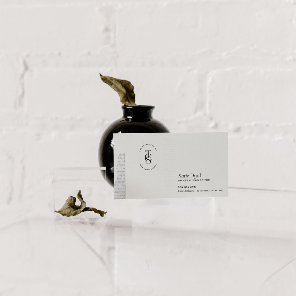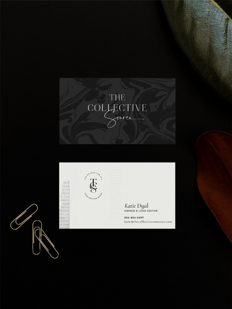 We wanted this new brand to feel highly editorial, fresh and sophisticated, and have the intense energy of a newsroom. The Collective Source operates like a combination of fast-paced journalism and rich editorial storytelling. Their digital team of writers thrive off of well-organized folders, aggressive deadlines, creative ownership, and enjoying the end of a productive workday, and we wanted the full brand to reflect that. We built upon the logo palette with a library of brand patterns and textures that played into the idea of the newsroom and also her urban inspiration. The inky marble textures give her brand a luxury finish, while the overlapped typeset newspaper pattern gives her content a layered, editorial, news-clipping aesthetic. We knew that these patterns would compliment her brand photography in a way that gives her flexibility in her marketing materials and added to the overall experience of the brand. Since launching The Collective Source, we’ve extended the brand online with a digital home base and website for the agency and assisted Katie as she’s rolled out the brand and begun curating her founding collective of writers. It’s been a joy to watch this company thrive and create opportunities for writers all over the country and inspire other creative service providers to think bigger.