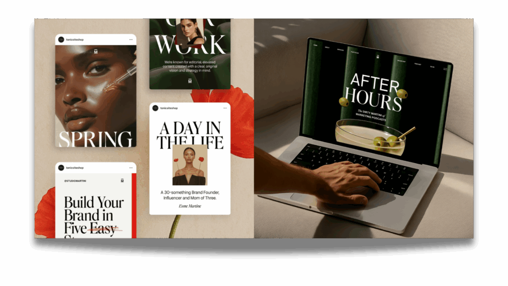 “The Martini Showit website template is for those who want their brand to show up, straight up, and look good doing it. In an era of disposable templates and AI-everything, it’s a return to what’s always worked — truly beautiful, editorial design that tells a captivating, fully-human story. Like a movie, you have to watch ‘til the end. A classic, with a modern twist. Created for any brand seeking a stage to speak up, rise, move up—Martini allows you to do it as your strongest self.”